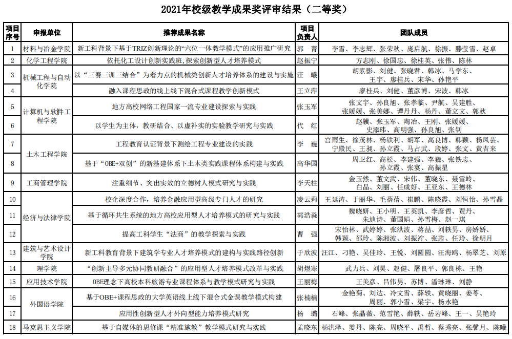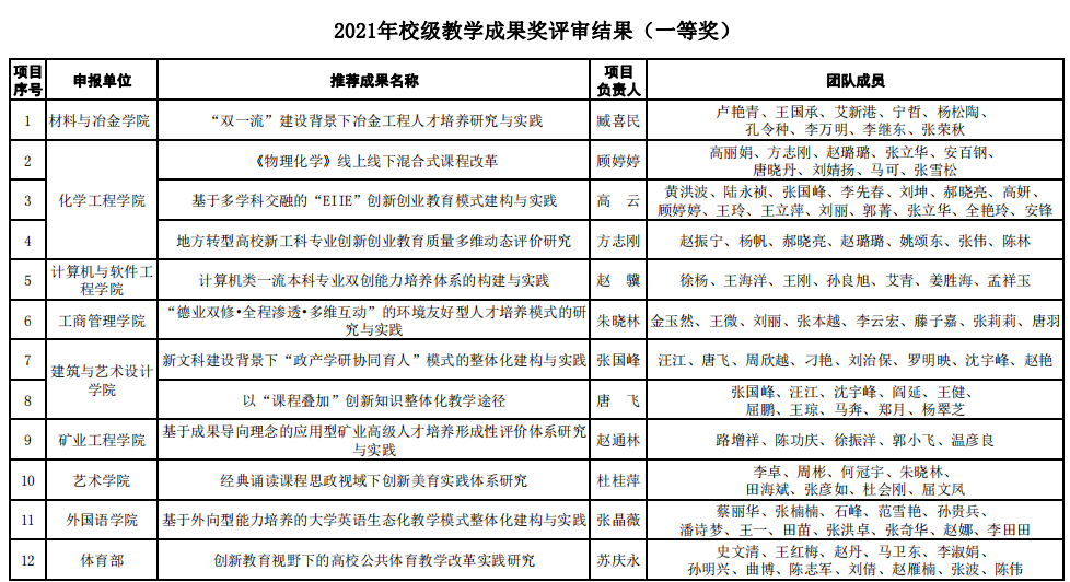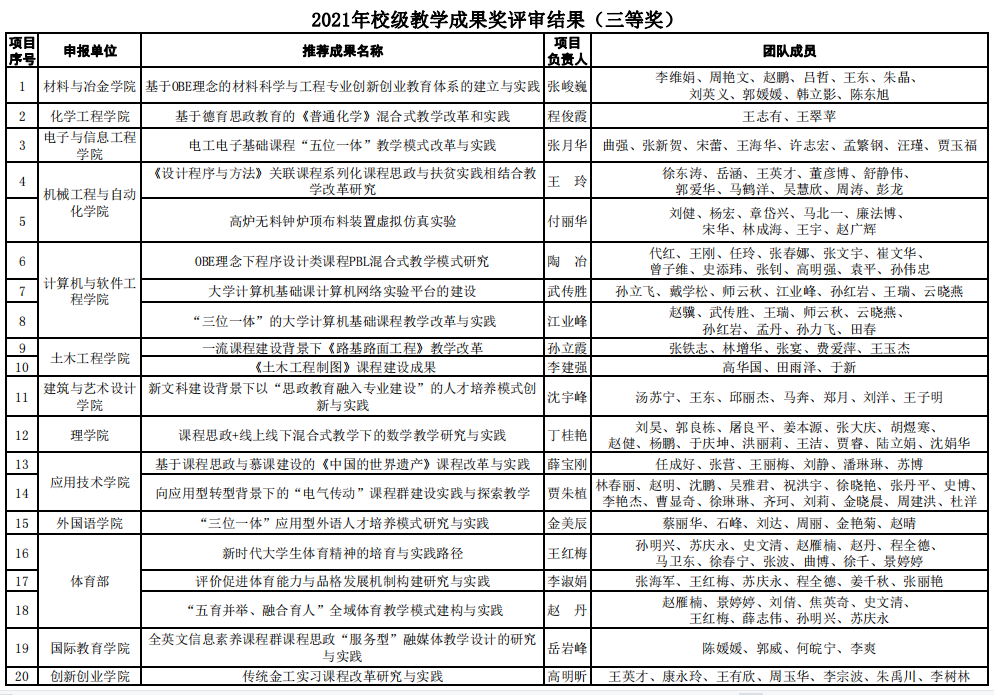 根据《关于开展易游2021年教学成果奖评选工作的通知》(易游(中国)教发【2021】35号)相关工作安排,各教学单位推荐参评2021年校级教学成果奖共62项。经专家评审,学校研究决定2021年校级教学成果奖获奖项目为50项,其中一等奖12项,二等奖18项,三等奖20项。获奖名单公布如下: