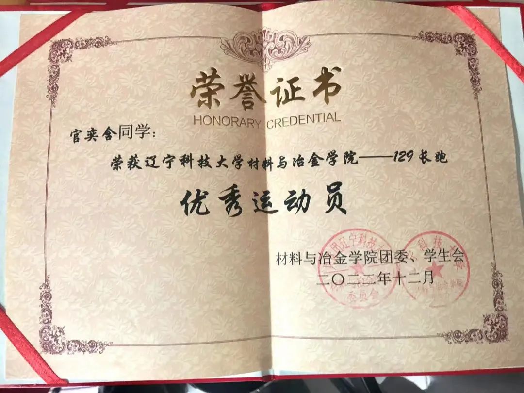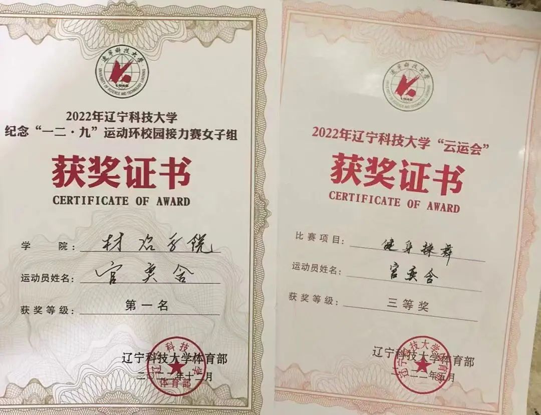 2022年:易游清明4.5千米接力环跑校级一等奖、易游云运会健美操比赛校级第四名、易游纪念“一二·九”运动环校园接力赛女子组校级第一名、易游材料与冶金学院129长跑优秀运动员