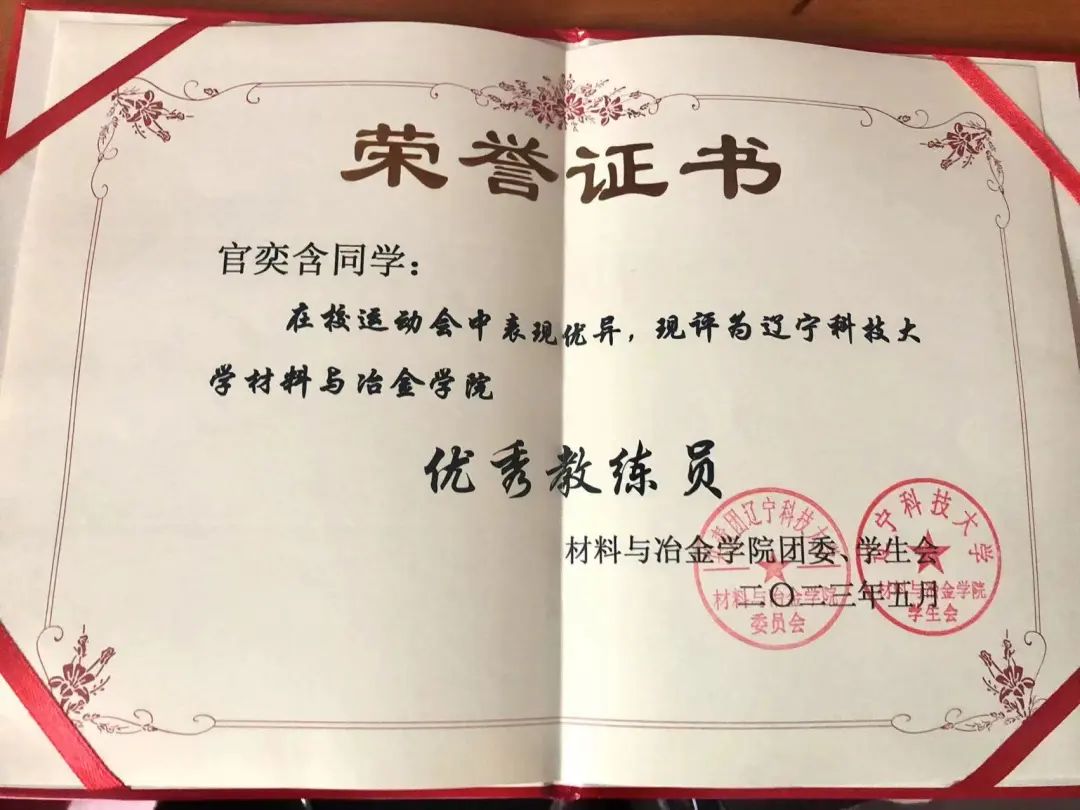2023年:第五十一届易游校园运动会女子跳高校级第三名、易游材料与冶金学院优秀运动员、易游材料与冶金学院优秀教练员、易游“校长”杯校园足球赛校级第一名、易游学生排球赛校级第一名、三级社会体育指导员