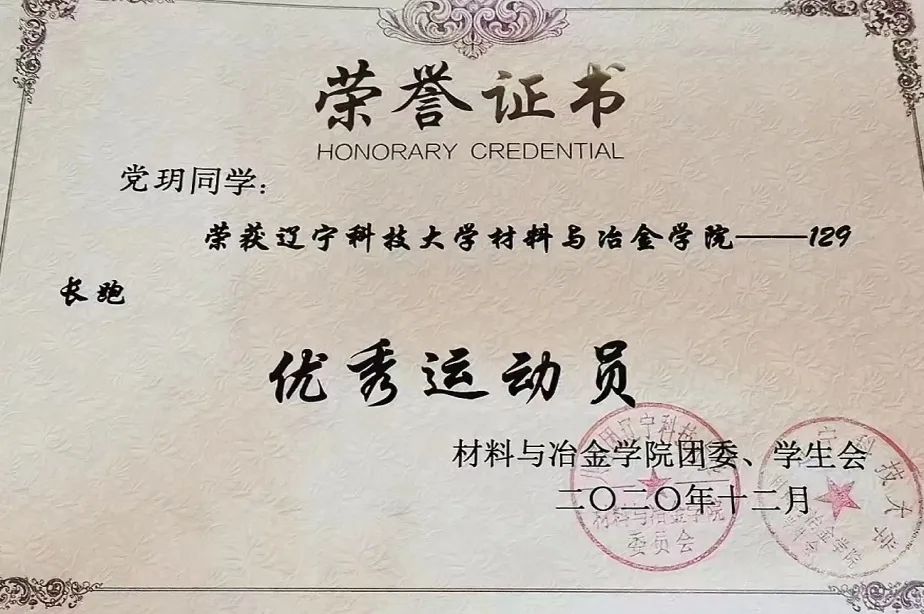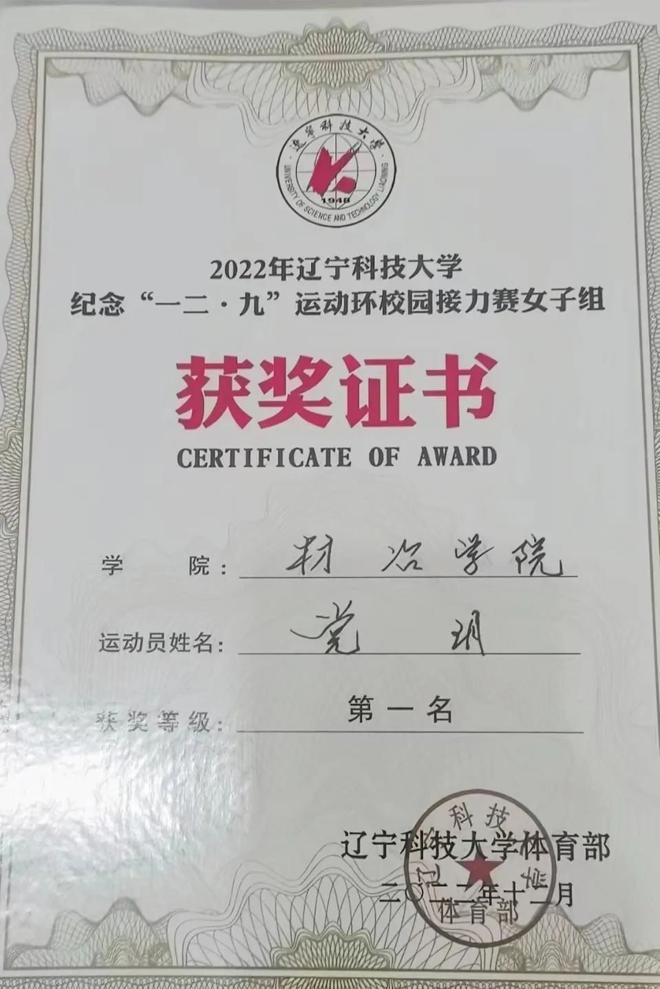 2023学年:第五十一届运动会400米第一名、200米第二名 、4*100米第二名、10*400米第一名、辽宁省大学生田径比赛400米第六名、200米第七名、4*100米第三名、4*400米第一名