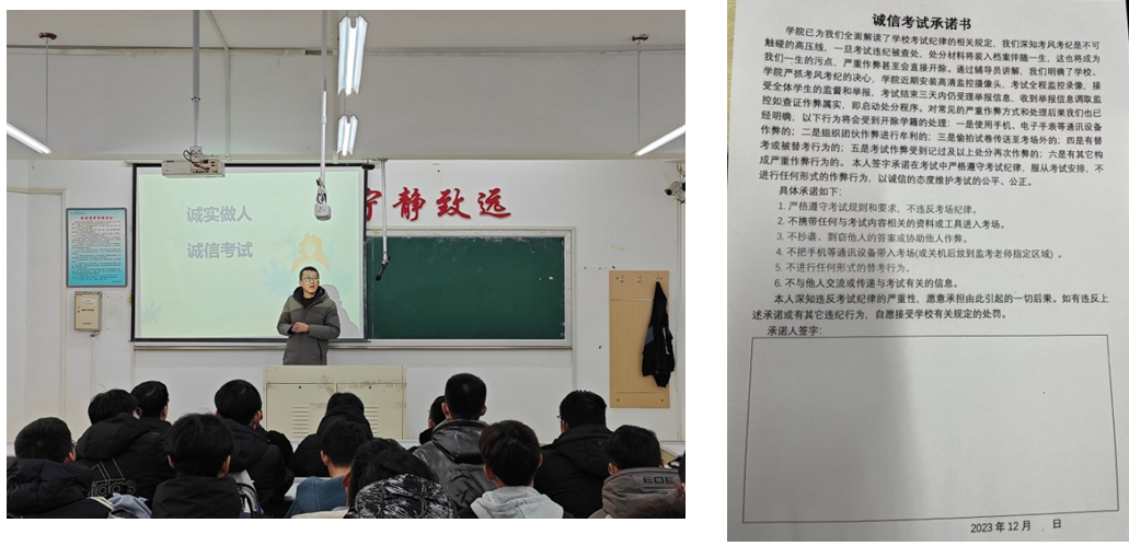 各专业班级通过主题班会等方式开展诚信考试宣传教育,辅导员带领全体同学认真学习了《易游学生考试违纪处理细则》等文件,并通报了以往因考试作弊受到处分的案例、严重后果。帮助同学们从思想上认识到诚信考试的重要性和必要性,全体学生签署了《诚信考试承诺书》,承诺依靠自己的努力学习取得优异成绩。