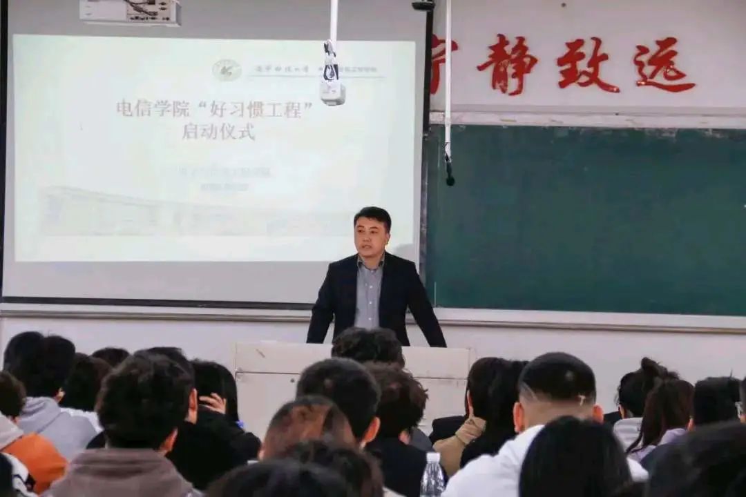 为深入学习贯彻习近平新时代中国特色社会主义思想,教育引导学生立志做有理想、敢担当、能吃苦、肯奋斗的新时代好青年,4月20日,电信学院于博闻楼五合教室举行“好习惯”工程启动仪式。党委副书记由济恺主持会议、学办主任孙倩、团委老师刘洋及团委学生会全体成员、大一大二全体学生骨干参加本次活动。
