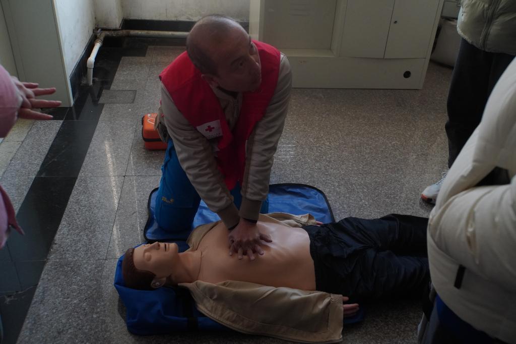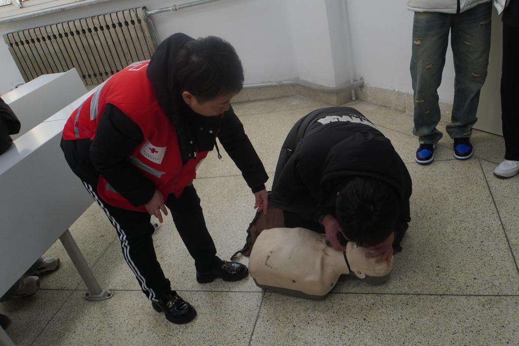 完成相应的理论学习后,师生们被分成4个小组,在红十字会专业老师指导下,采用“实景模拟”的方式开展CPR的实操训练。红十字会的老师们细致地对师生们的动作进行指导和纠正,从救护姿势、力度、角度等方面讲解救护重难点,以及在救护过程中需要注意的问题和经常出现的错误,帮助师生们切实掌握心肺复苏技能。全体参训师生认真聆听,仔细观摩,积极参与,轮番上阵,互为搭档,相互学习,练习十分投入,力求每个步骤、每个动作都标准规范。
