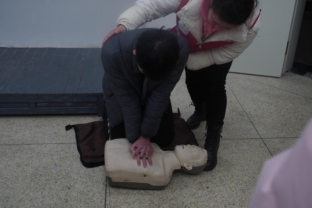校医院院长程瑶为参训师生讲解了掌握急救技能的要性和掌握黄金四分钟内进行心肺复苏救援技能的重要性红十字会志愿者胡老师结合实际救援经历,通过视频案例和图文资料,细致生动地讲解了气道异物梗阻施救过程,介绍了CPR的专业知识,以及AED机器的使用方法。利用人体模型进行“徒手心肺复苏”演示,从伤者心跳呼吸的判断,体位的正确摆放,气道的打开手法,到急救的姿势和操作,为参训师生们生动讲解了心肺复苏应急救护全过程。老师将要点用口诀一一细化,反复强调,并呼吁大家在保护自身安全的情况下,抢夺“黄金分钟”,拯救生命。