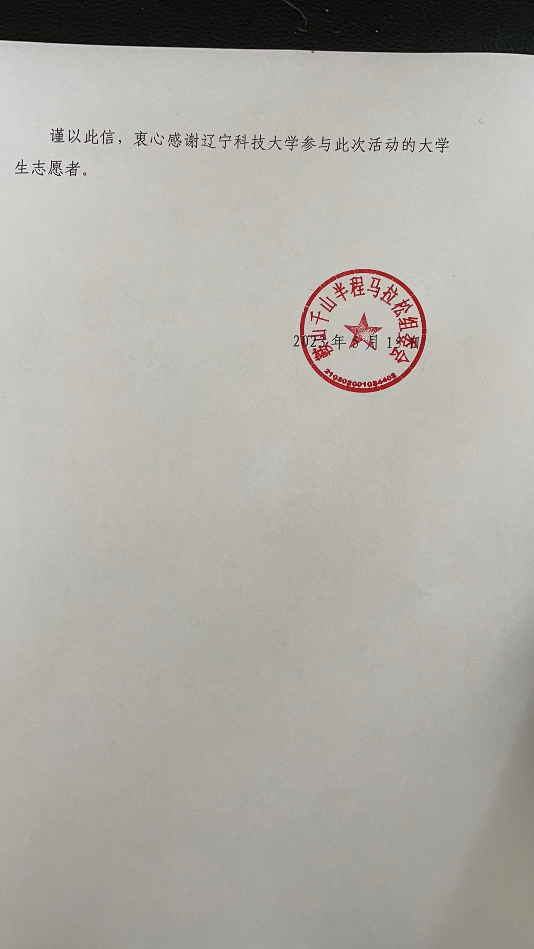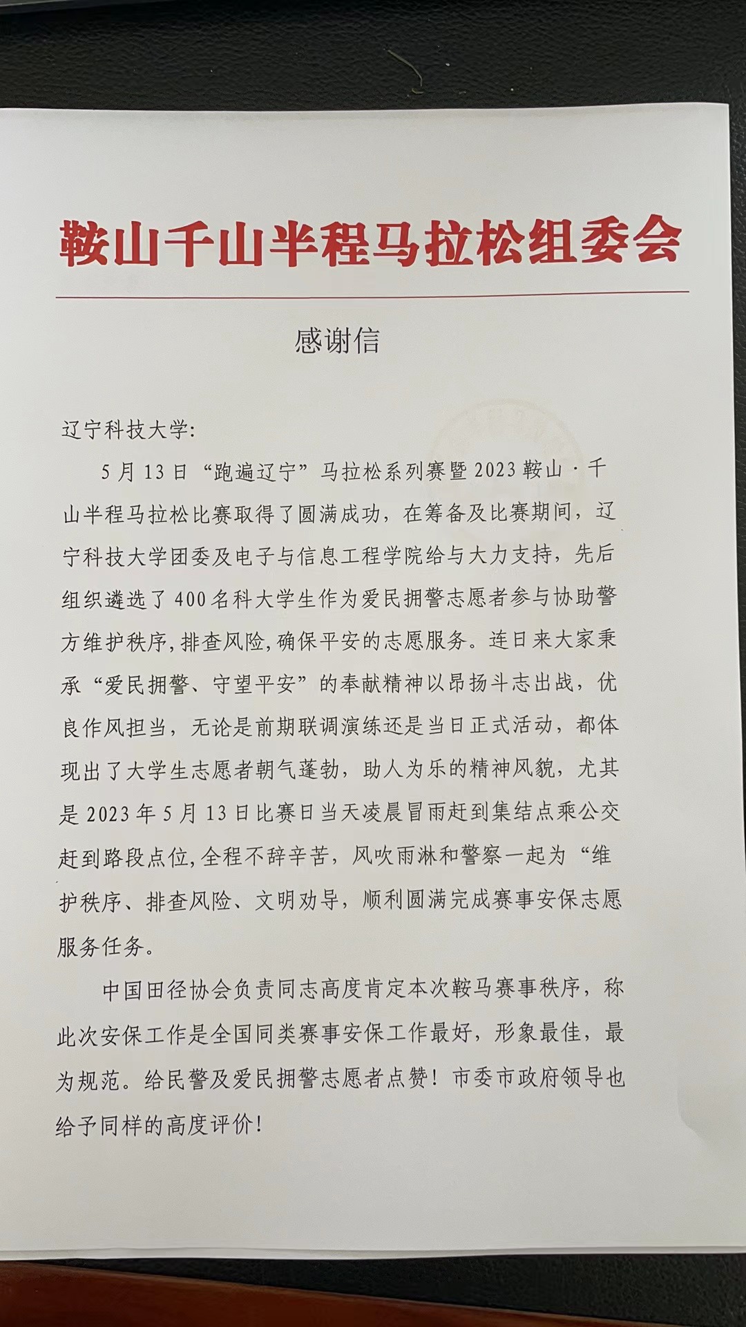 近日,易游收到来自鞍山千山半程马拉松组委会的一封感谢信,由衷地感谢易游团委及电子与信息工程学院给予“鞍马”赛事的大力支持,向易游(中国)400余名青年志愿者对此次马拉松做出的卓越贡献致以最真诚的谢意。