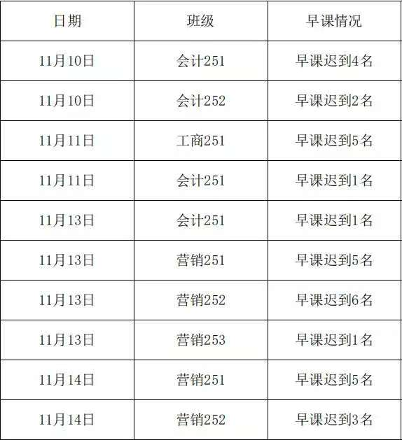 为进一步落实“好习惯工程”相关工作要求,扎实推进学院学风建设十项措施,营造安全、文明、积极、有序的育人环境,工商管理学院持续开展学生寝室内务检查与早、晚课巡查工作。现将第十一周检查情况通报如下: