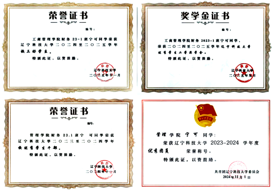 在学习上,宁可严格要求自己,在专业77名同学中位列第3,综合成绩为91.27。通过英语四级和计算机二级,获得2024-2025学年度校二等奖学金,2023-2024学年度校三等奖学金,获校优秀学生干部、校三好学生、优秀团员荣誉称号。