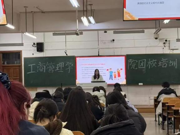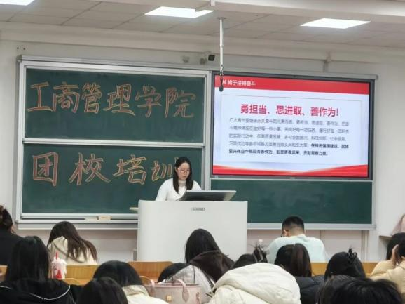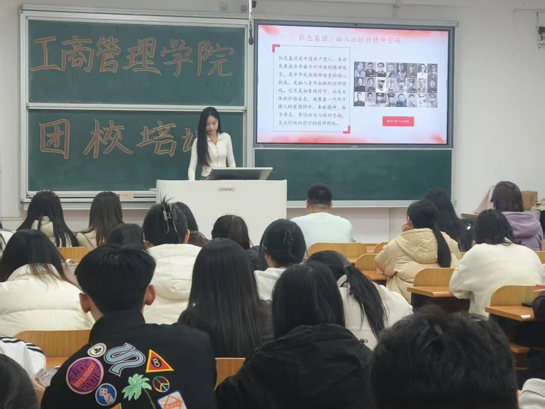 理论培训环节,多位优秀学生骨干将理论阐释与青春视角深度融合,为理论学习注入了蓬勃朝气,让红色思想入脑入心。工商管理学院分团委副书记郑旭婷围绕“学团史强信念,做新时代合格共青团员”,系统讲解了共青团从成立之初至今的发展脉络,明确了团员在思想觉悟、责任担当等方面的要求,引导学子找准团员身份定位;学生会主席颜钰金以“回望历史,革命岁月中年岁相仿的我们”为题,通过讲述革命年代青年英烈的奋斗故事,以时空对话的独特视角,让学子直观感受“同龄人”的家国情怀与使命担当;团务办公室负责人刘雨竹以“强国之梦 青年担当”为题,从爱国主义的历史传承切入,结合新时代国家发展需求,深刻阐释了青年与强国建设的紧密联系,激发学子的责任意识;主席团成员宁可以“青年与时代同行,红色精神永流传”为核心展开讲解,通过剖析红色精神的核心内涵与时代价值,揭示了红色精神传承与团员使命担当的内在关联,引导学子将红色基因融入青春血脉;志愿服务部负责人刘秋实以“传承红色基因,争做有理想的新时代团员”为核心,结合志愿公益实践案例,讲解了如何在服务他人、奉献社会中践行红色精神,让理想信念落地生根;文化活动部负责人张佳慧以“学习新思想,争做时代好青年”为核心,以“有理想、敢担当、能吃苦、肯奋斗”为成长坐标,结合青年成长实际,为学子指明了新时代青年的成长路径与奋斗方向。