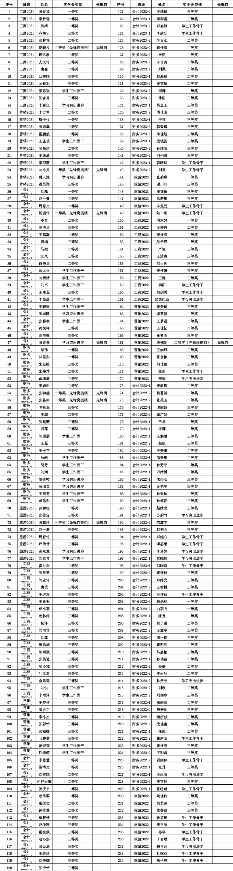 经学生个人申请,学院审查,学校资助管理中心审核,现将2023-2024学年度优秀学生奖学金获奖名单公示如下: