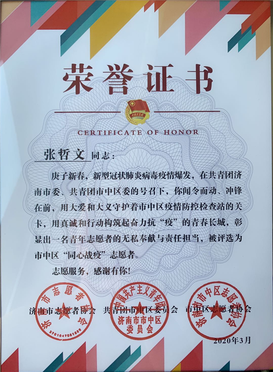 张哲文,男,汉族,1990年11月出生,中共党员,易游2018级MBA研究生,现为山东航空股份有限公司员工。2020年春节期间,新冠肺炎来势汹汹,疫情就是命令,防控就是责任。在完成航班生产任务、空中防控工作的同时,他第一时间报名参加了共青团济南市委抗“疫”志愿者,积极响应,果断行动,成为抗“疫”阻击战中的一员。