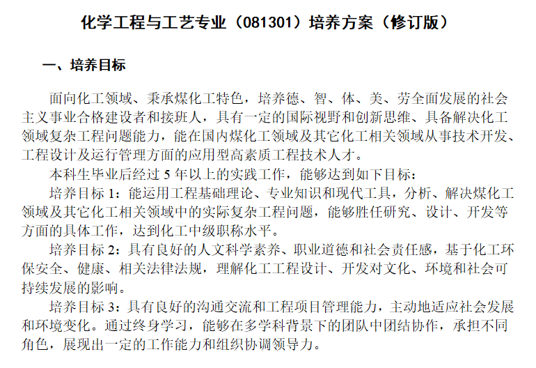 化学工程学院化学工程与工艺专业培养目标(工程教育专业认证)