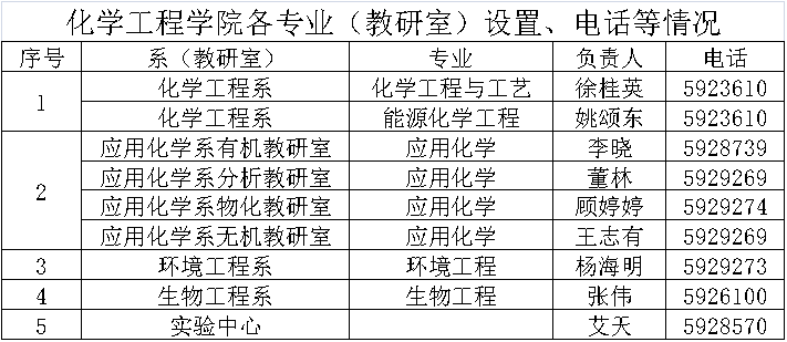 化学工程学院各专业(教研室)设置、电话等情况