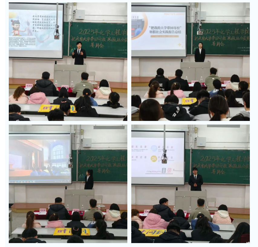 为了总结寒假社会实践成果,交流实践经验体会。化工学院于2025年3月18日在博学楼A201教室组织召开“把我的大学带回母校”寒假社会实践答辩会。学院寒假实践团队成员及同学代表参会。