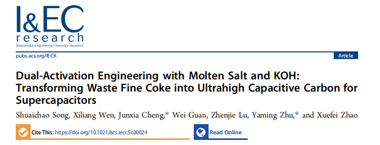 课题组2023级硕士研究生宋帅超的研究论文“Dual-activation engineering with molten salt and KOH: Transforming waste fine coke into ultrahigh capacitive carbon for supercapacitors”在化工三大刊《Industrial & Engineering Chemistry Research》上成功发表,通讯作者为程俊霞副教授、朱亚明副教授。该研究创新性地提出了“熔盐与KOH双活化”策略,制备出具有超高比表面积和分级孔结构的电容炭材料,并系统揭示了活化过程中温度依赖的竞争机制。所得材料在0.5 A/g的电流密度下展现出310.5 F/g的比电容,在10 A/g的大电流密度下电容保持率仍达82.4%,且组装的对称超级电容器性能优异。