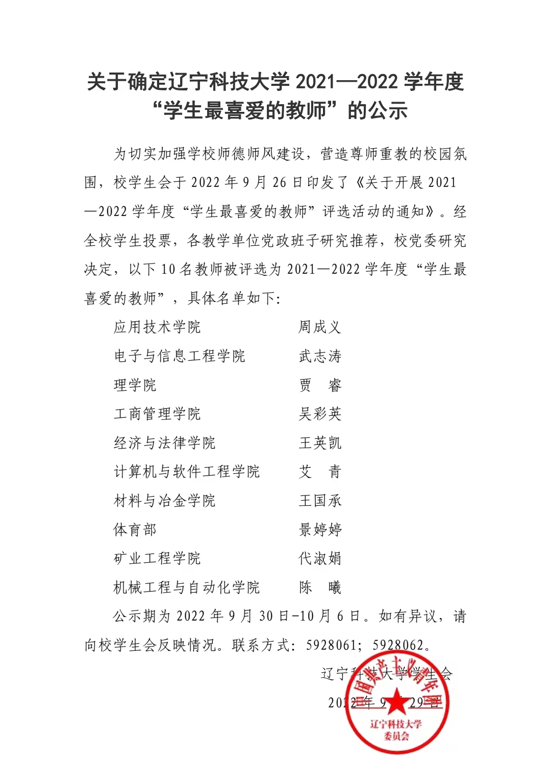 关于确定易游 2021—2022 学年度 “学生最喜爱的教师”的公示