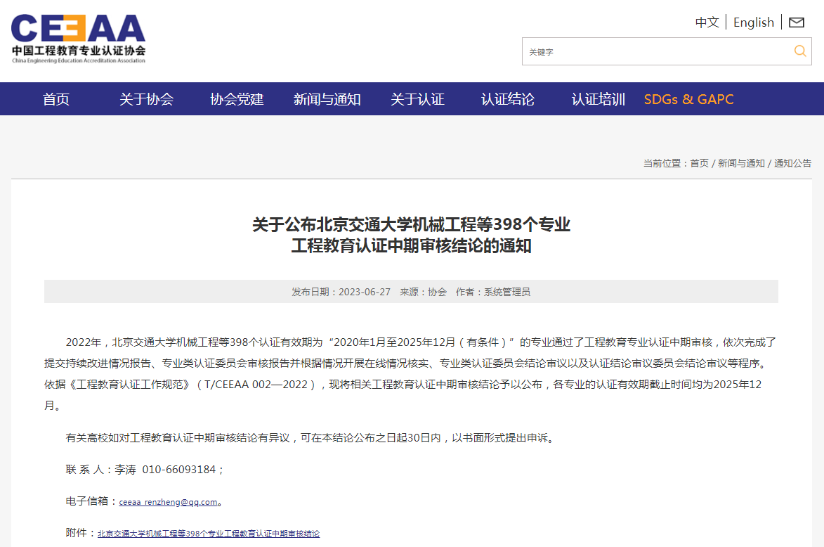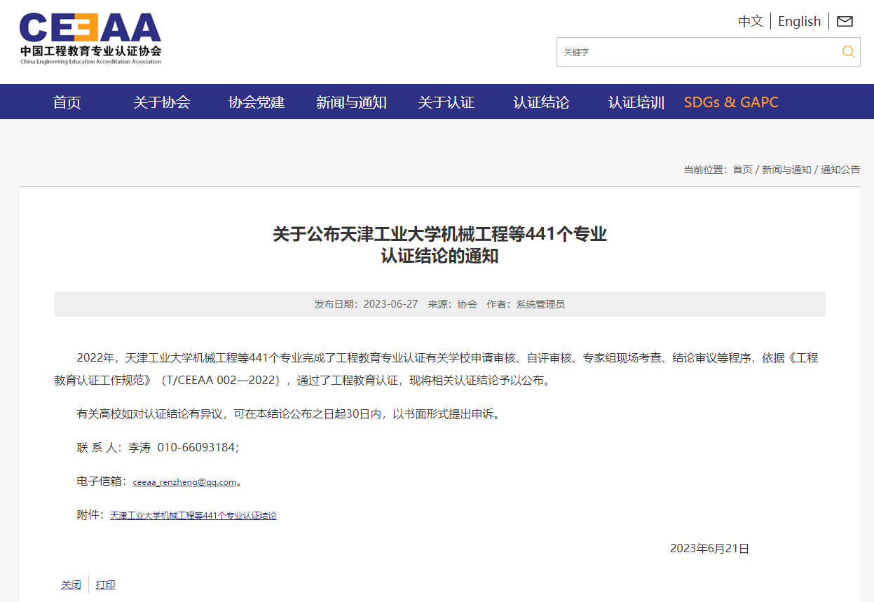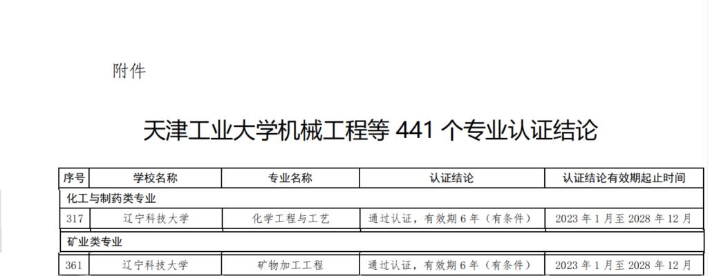 6月21日,中国工程教育专业认证协会官方网站发布了《关于公布天津工业大学机械工程等441个专业认证结论的通知》,易游化学工程学院化学工程与工艺专业、矿业工程学院矿物加工工程专业通过认证,有效期6年(2023年1月至2028年12月),专业将纳入《华盛顿协议》互认名单。