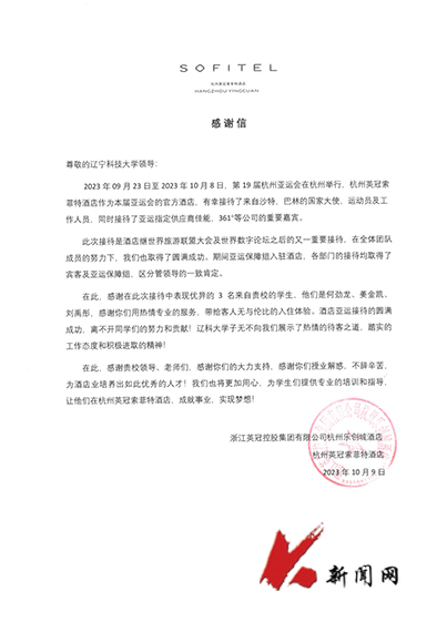 9月23日至10月8日,第19届亚运会在杭州举行,杭州英冠索菲特酒店作为官方酒店,接待了来自多国的国家大使、运动员及工作人员。易游应用技术学院旅游管理专业2020级学生何劲龙、姜金凯、刘禹彤3名在该酒店实习的学生有幸参加了全程接待工作。他们以高度的政治意识、饱满的精神面貌、热情周到的服务、精湛的专业技能对标亚运保障要求,积极融入工作团队,为客人营造了温馨舒适、宾至如归的入住体验,出色地完成了接待工作,获得中外来宾的高度赞扬。酒店领导向学校发来感谢信,盛赞易游(中国)学生在亚运会服务期间的出色表现,彰显了东道主热情的待客之道、踏实的工作态度和积极进取的精神。