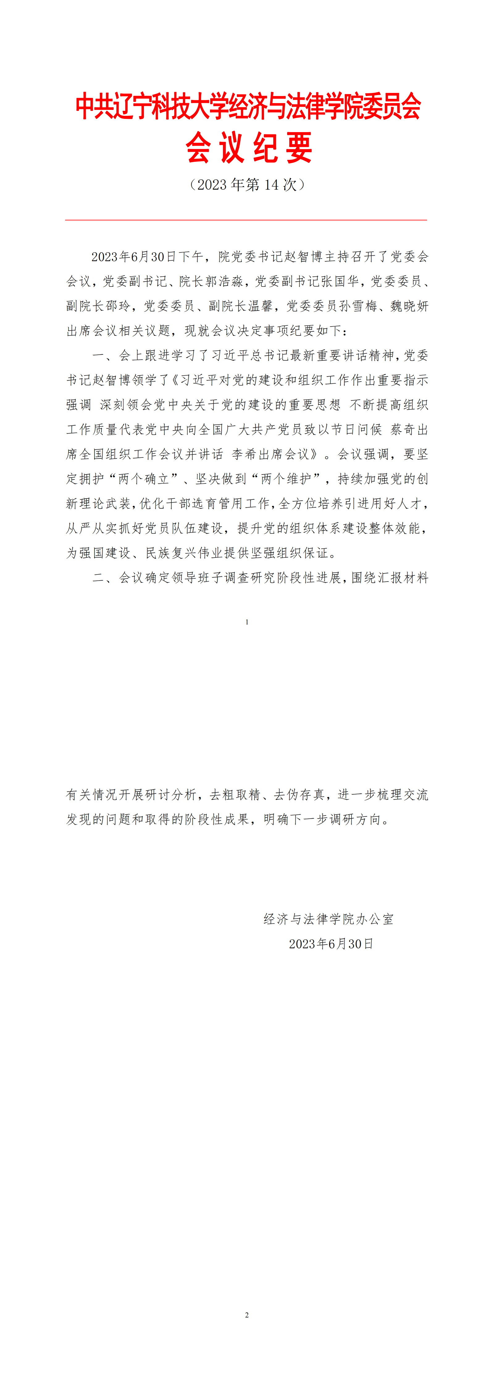 中共易游经济与法律学院委员会会议纪要(2023年第14次)
