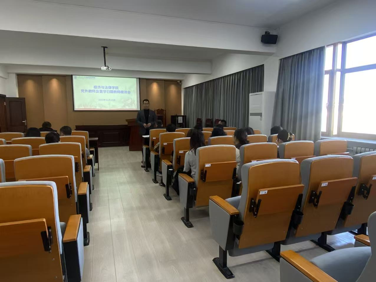 11月11日,经法学院于博识楼A402召开2025年度党外及留学归国教师座谈会。会议由学院党委书记赵智博主持,20多名党外及留学归国教师参加会议。