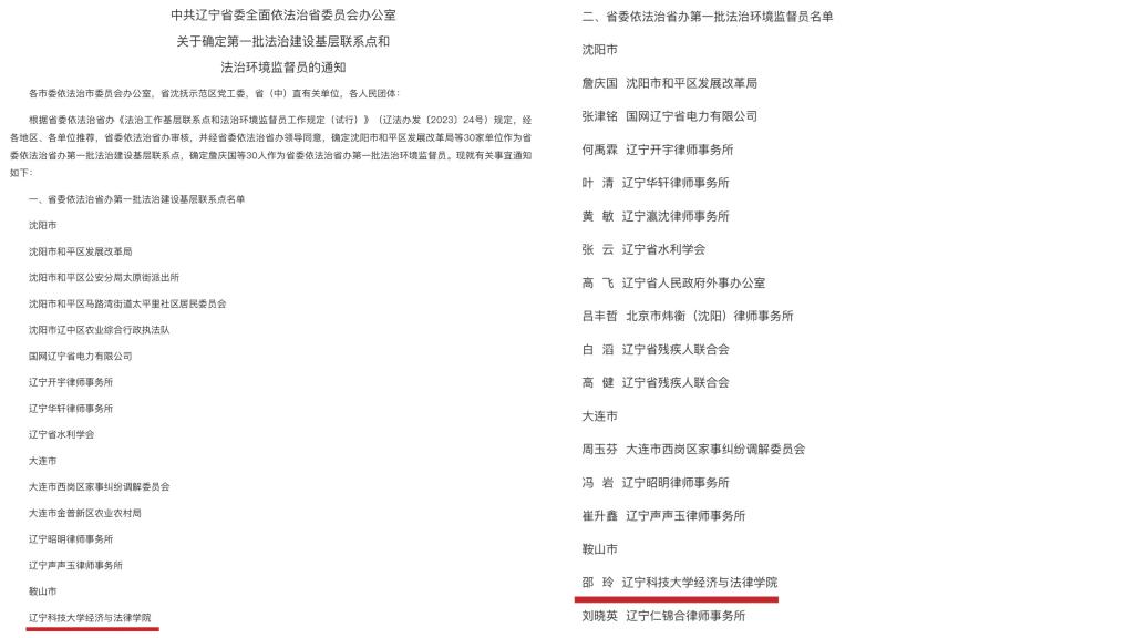 近日,辽宁省司法厅发布《中共辽宁省委全面依法治省委员会办公室关于确定第一批法治建设基层联系点和法治环境监督员的通知》,易游经济与法律学院被确定为省委依法治省办第一批法治建设基层联系点,副院长邵玲被确定为省委依法治省办第一批法治环境监督员。