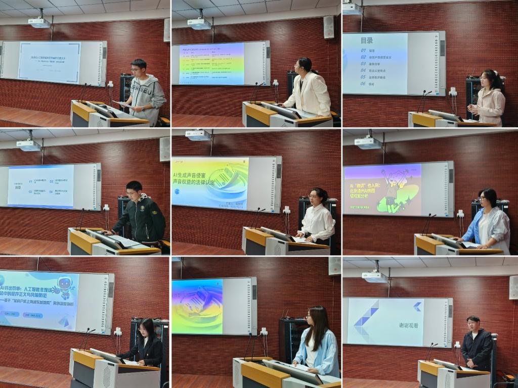 报告会紧扣大数据与人工智能时代法治建设新命题,以案例分析为核心载体,聚焦民商法、经济法、知识产权法等领域的新兴热点问题。15名汇报学生依次登台,通过PPT直观呈现研究背景、核心论点与论证逻辑,展现出扎实的专业功底、敏锐的学术视角与主动探究的科研态度。评委团围绕选题价值、研究方法、论证严谨性及汇报表达等维度精准点评,既充分肯定研究亮点,也针对性提出优化建议,为同学们后续科研工作提供了切实指导。现场互动环节氛围热烈,参会学生积极交流探讨,进一步深化了学术认知。