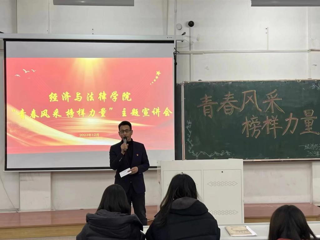 12月10日,经法学院于博学楼C102开展“青春风采 榜样力量”主题宣讲会。学院优秀学生代表2023年钢铁标兵年度人物代郁璇、十佳大学生张诗晗琪、道德楷模刘豪、十大学习标兵于澜受邀担任宣讲人,经法学院党委书记赵智博以及团学骨干出席会议,学院2022级、2023级350名本科生参加会议。