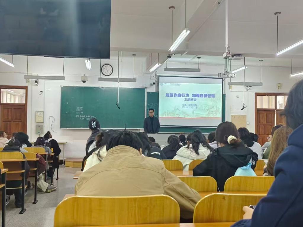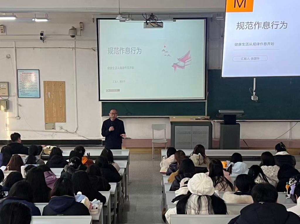 最后,辅导员围绕规范作息行为强调指出,良好作息对身心状态和学习效率的重要意义,号召学生自觉遵守学校作息管理要求,坚持规律生活、保证充足睡眠。辅导员还特别提出要增强宿舍集体意识与自我管理能力,共同维护宿舍卫生与秩序,营造整洁、安静、和谐的生活环境,促进优良寝风建设。