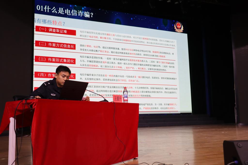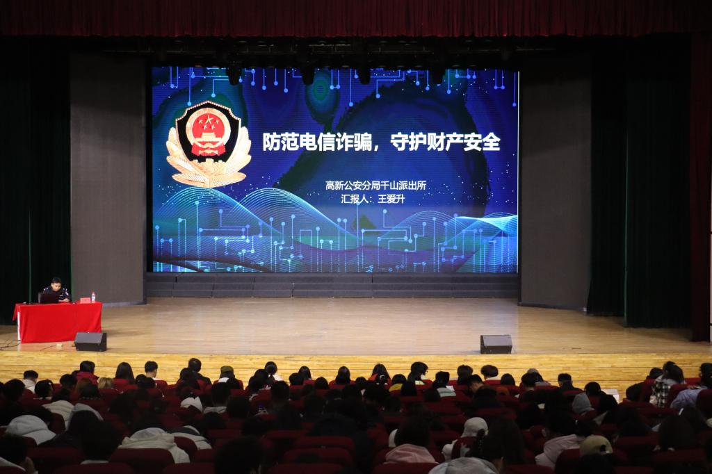 在防范电信诈骗,守护财产安全板块中,高新公安分局千山派出所警员王爱升围绕“什么是电信网络诈骗”展开讲解。他结合“冒充电商物流客服”“AI换脸”“杀猪盘”等典型案例,详细介绍了常见诈骗手段及防范要点。最后,他向学生们提供了一系列防范与补救措施,提醒大家在遭遇电信诈骗时应保持冷静,积极配合警方调查,切实守护好个人财产安全。