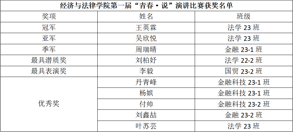 青春正当时,不予负流年。此次演讲比赛不仅锻炼了学生的语言表达能力,还增强了学生的文化底蕴,充分展现了经法学子积极向上、自信从容的精神风貌,提高了学生的综合能力,对营造良好的校园文化氛围、促进青年学子树立坚定理想信念起到积极作用。