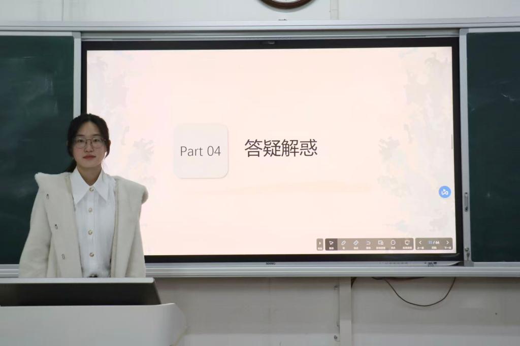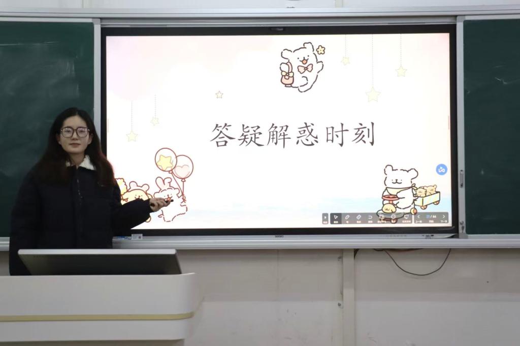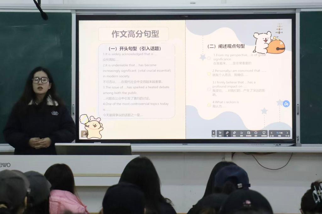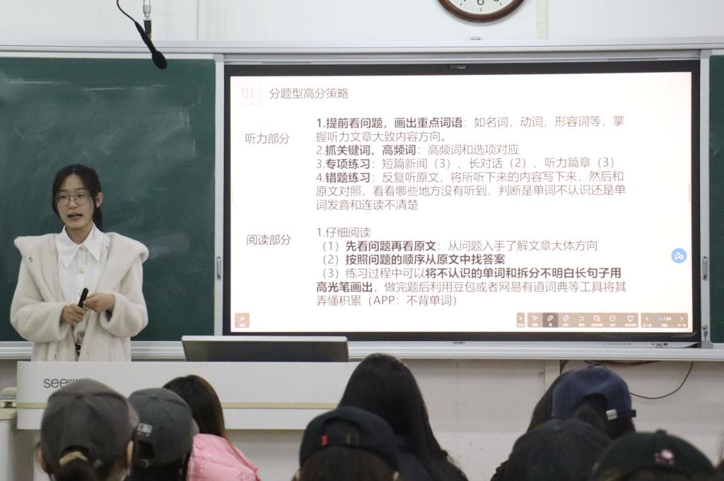 会议伊始,主持人赵萌对同学们的到来表示热烈欢迎,并对四级考试的时间安排进行了详细介绍,重点提醒同学们在考试中要合理分配时间、把握作答节奏。随后,法学24班张珊进行经验分享,她结合自己的四级成绩与备考方法,深入剖析考试难点,提出应对不同题型的“战术策略”,强调“分题型提高分”的重要性,并逐项解析听力、阅读、写作等板块的备考技巧,建议同学们做到针对性复习、精准突破。接着,法学24班蔡伟萍受邀上台,就英语写作的重难点进行讲解。她重点介绍了“作文高分策略”,指出开头段在引出主题中的关键作用,强调观点句应简洁清晰,并建议同学们在写作中灵活运用多样句型,构建文章骨架。同时,她鼓励大家积累名言警句,在正文中恰当引用,以提升整体表达的丰富度与感染力。在最后的“答疑解惑”环节,现场气氛活跃。同学们积极提出自己在英语学习中的困惑,由学生代表结合经验一一分析、解答,帮助大家化解长期以来的疑问。