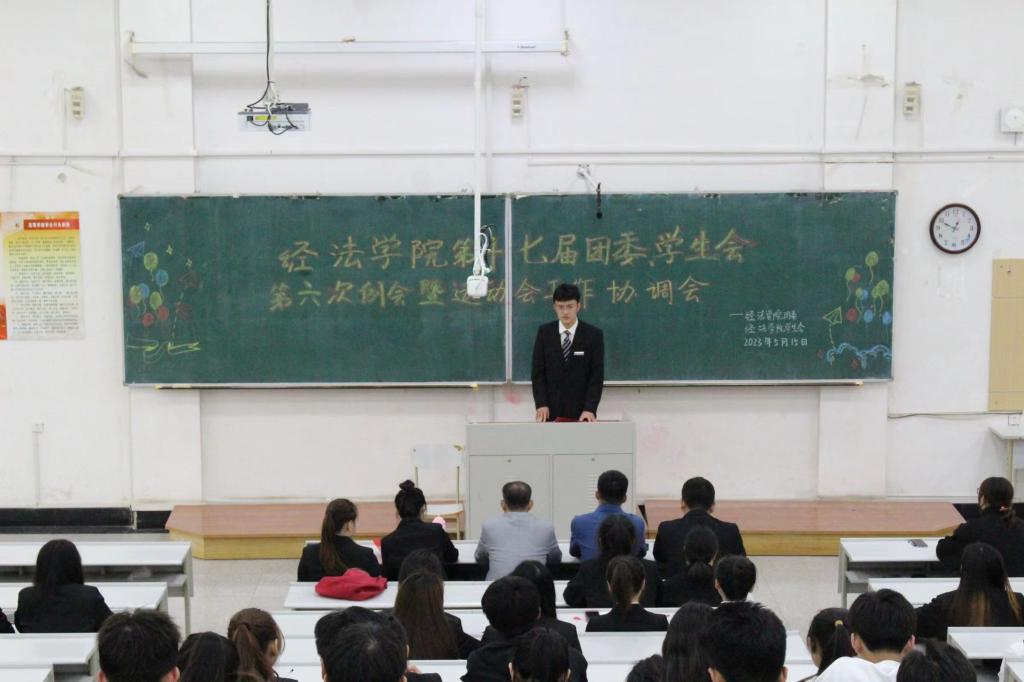 5月15日,经法学院于博学楼A301召开第十七届团委、学生会第六次例会暨运动会工作协调会,本次会议由经法学院团委副书记张鹏飞主持,学院党委副书记张国华、全体学生骨干以及全体运动员出席了本次会议。