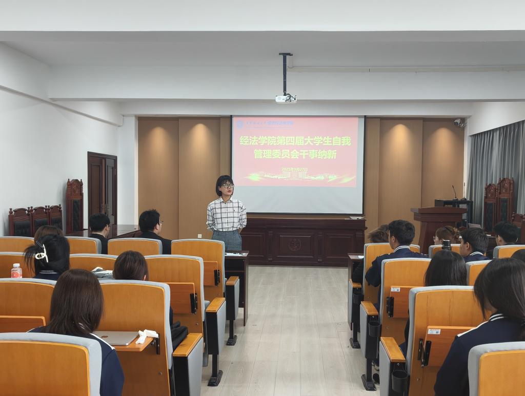 9月27日下午,经法学院于博识楼A402召开经法学院第四届大学生自我管理委员会(简称自管会)干事竞选会议。会议由经法学院自管会主席刘鑫喆主持,学院学办主任李路云出席会议,共有20名同学参与竞选。