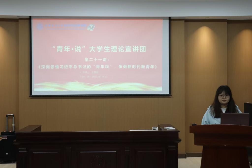 宣讲会上,王莞舒以深刻领悟习近平总书记的青年观,争做新时代新青年为主题,从时代、理论、价值、实践四个维度带领同学们深度解读其主要内容,引导学生深刻认识习近平总书记青年观的理论与现实意义。她指出,大学生作为新时代发展的中坚力量,应坚定理想信念、敢于挺膺担当、甘于吃苦耐劳也要肯于拼搏奋斗,在推进强国建设、民族复兴伟业中展现青春作为、彰显青春风采、贡献青春力量。