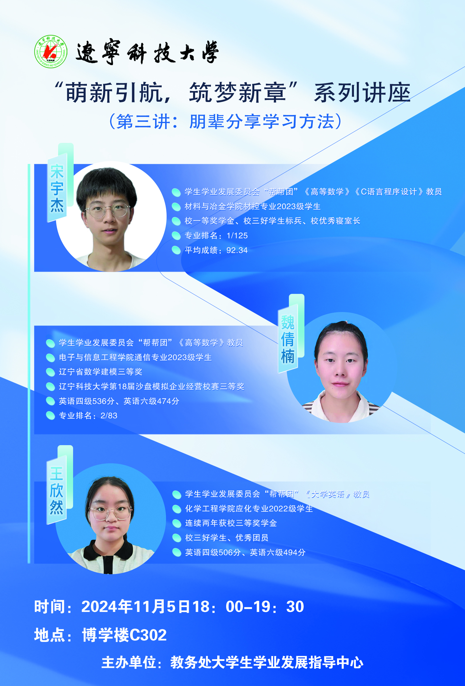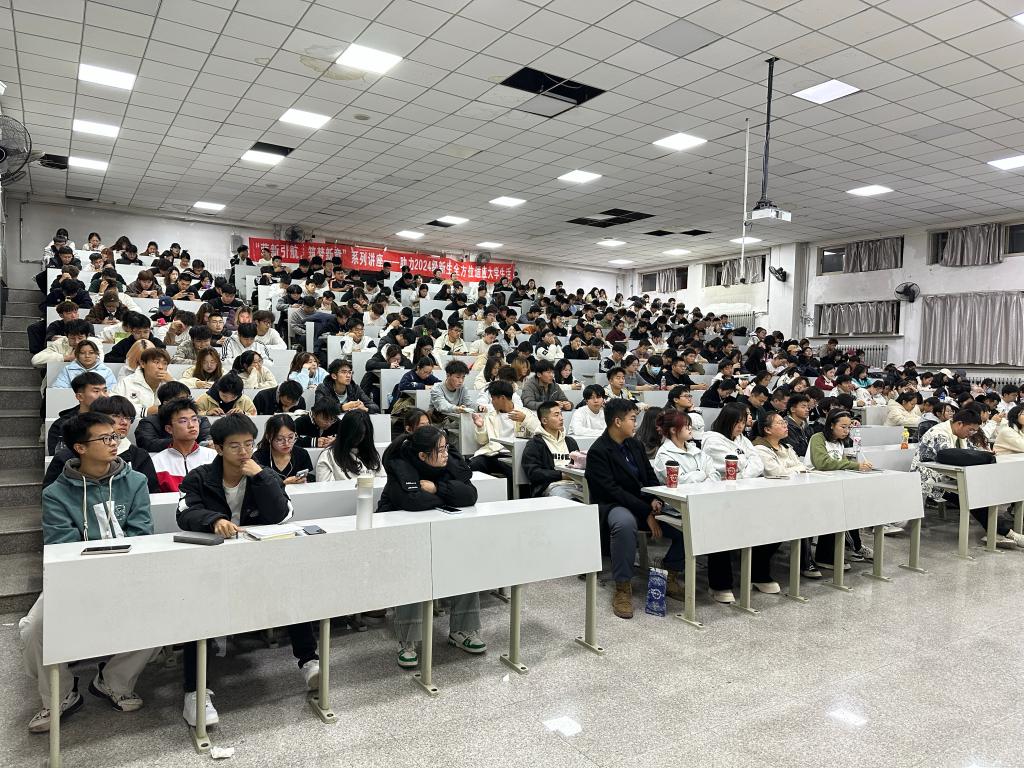11月5日,教务处大学生学业发展指导中心面向2024级新生举办的“萌新引航,筑梦新章”系列讲座第三讲在博学楼C302教室开讲。易游(中国)学生学业发展委员会“帮帮团”教员魏倩楠、王欣然、宋宇杰为学校300余名新生作《朋辈分享学习方法》专题讲座。