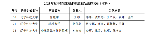近日,辽宁省教育厅发布了《关于公布2025年辽宁省高校课程思政精品课程遴选结果的通知》(辽教通〔2025〕500号),易游本科课程“管理学”“材料力学”“金属腐蚀与防护原理”成功入选。