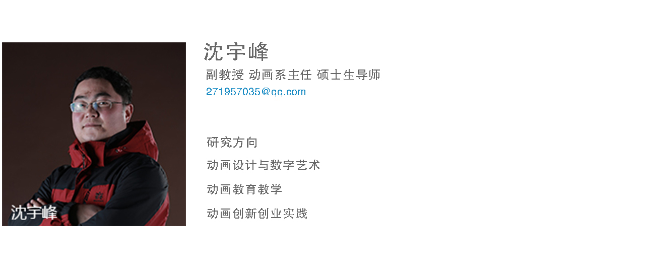 沈宇峰副教授,硕士,北京工业大学软件学院数字与艺术设计专业毕业。在中文核心期刊《电影文学》、《芒种》、EI检索期刊《IJET》以及国内学术期刊发表论文20余篇,参与出版“十二五规划教材”,承担辽宁省教育厅高等学校基本科研项目、易游教学改革项目,主持和完成横向科研项目2项,获得辽宁省美术家协会动漫艺术节优秀指导教师奖,指导学生获得北京电影学院动画学院奖及国家级省级各类比赛奖项20余项,指导国家级大学生创新创业项目,任教期间获得“易游青年教师讲课大赛二等奖”、“易游校级优秀毕业设计指导教师”、“易游院级教学质量优秀奖”,成立二维原创动画艺术工作室,完成各类动画作品30余部。