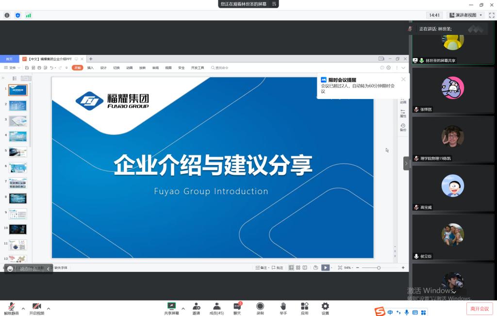 本次分享会邀请到就职于福耀玻璃工业集团股份有限公司23届光电专业校友林世圣为同学们作经验分享。林世圣从企业的基本情况、负责岗位职责、专业与工作衔接度和工作心得体会开展分享。一是学无止境,要让自己始终保持学习的状态,无论是向他人学习还是通过自学等方式进一步丰富自己,提高自身综合素质;二是做好充足准备,他建议大家在收到面试通知的时候,去查阅这家公司的招聘相应岗位信息,并进行详细解读,提升面试成功概率,积累面试经验;三是建议合理地为自己做好规划,避免毕业前因待就业而产生焦虑,保持良好心态;四是建议多参加线下的招聘会,可以面对面地和企业负责人沟通交流,可以更直接地解决就业疑问。