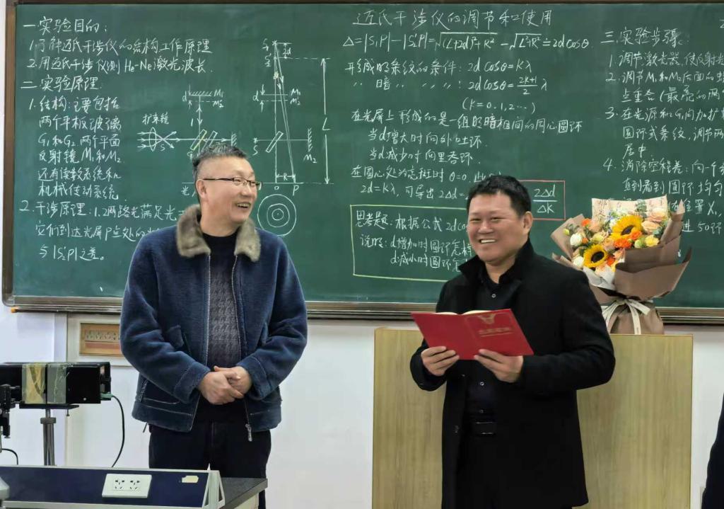 刘国良向郇维亮颁发荣休证书,代表全院教职工向郇维亮表达深深敬意。他表示,郇老师自2002入职学校以来,深耕理学院物理实验教学一线23年,始终恪尽职守、诲人不倦,凭借深厚的学识滋润着学子们的心田,以高尚的师德诠释着师者的担当,是学院发展的见证者与推动者。他衷心祝愿郇维亮退休后身体健康、幸福常伴。