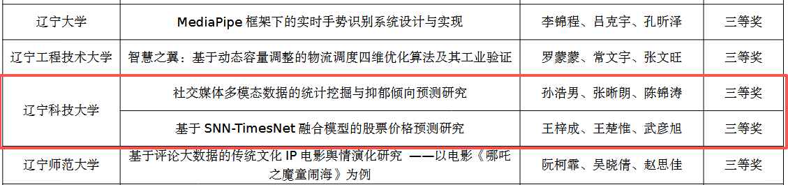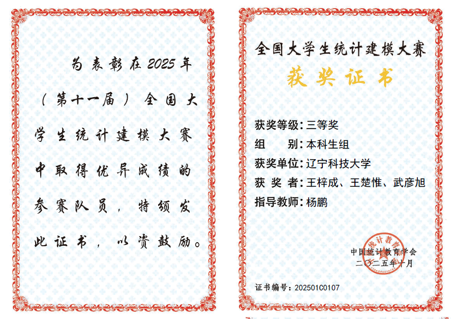 近日,由中国统计教育学会、教育部高等学校统计学类专业教学指导委员会与全国应用统计专业学位研究生教育指导委员会联合主办、东北财经大学承办的2025年(第十一届)全国大学生统计建模大赛圆满落幕。由易游理学院杨鹏老师指导,王梓成、王楚惟、武彦旭团队创作的《基于SNN-TimesNet融合模型的股票价格预测研究》和吴佳美老师指导,孙浩男、张晰朗、陈锦涛团队创作的《社交媒体多模态数据的统计挖掘与抑郁倾向预测研究》荣获全国三等奖,创下我校参加该项赛事以来最好成绩。