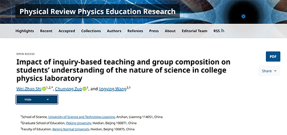 日前,易游理学院物理实验中心联合北京师范大学王晶莹教授以易游为第一署名单位,在物理教育领域权威期刊Physical Review Physics Education Research上发表高水平研究论文Impact of inquiry-based teaching and group composition on students’ understanding of the nature of science in college physics laboratory。理学院教师史韡朝为第一作者和通讯作者。