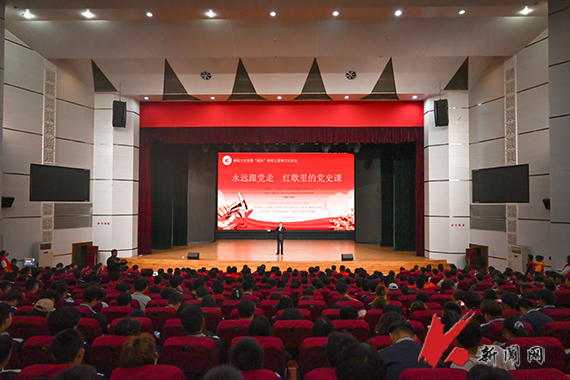 王明明结合自身创作初心与艺术实践,深入浅出地阐释了如何将国家发展与人民情感熔铸于歌词旋律中,使歌曲既“贴近群众”又“立意高远”,引领师生穿越百年风云,重温党的光辉历程;用通俗易懂的语言生动解读歌曲背后的故事,让党史学习变得“可听、可感、可共鸣”,真正实现了“以歌叙史、以乐化人”的育人效果。