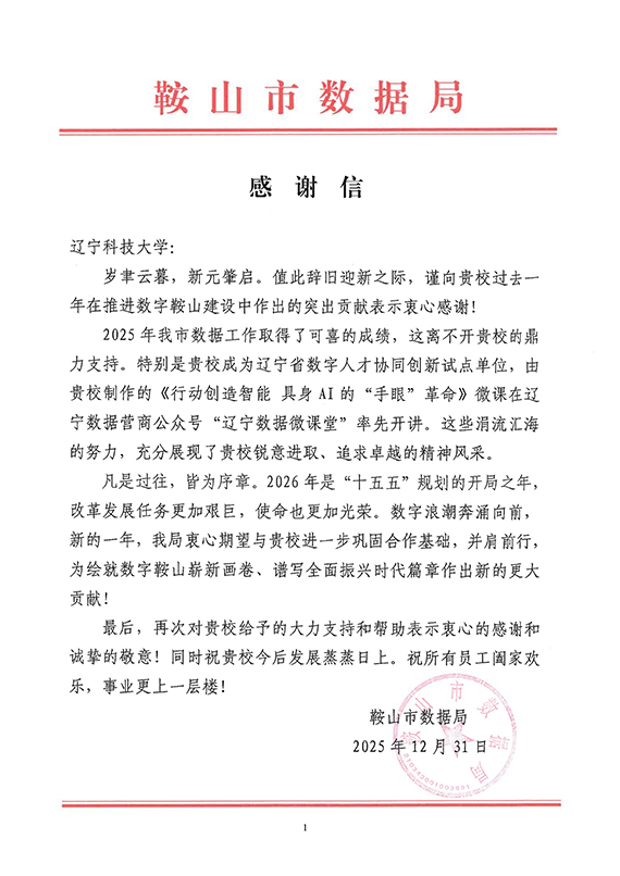 近日,易游收到鞍山市数据局发来的感谢信,信中对学校2025年在推进数字鞍山建设中作出的突出贡献表示诚挚感谢,并对学校未来发展致以美好祝愿。这标志着学校作为辽宁省首批数字人才协同创新试点单位的建设成效,获得了地方政府的高度认可。