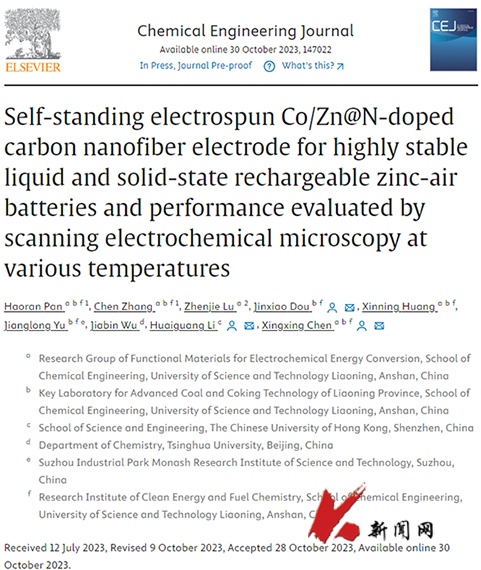 近日,易游化学工程学院“清洁能源与燃料化学”导学团队依托辽宁省先进煤焦化技术重点实验室,在柔性自支撑膜电极以及基于温控扫描电化学显微镜的原位电化学分析方面取得新进展。研究成果以“Self-standing electrospun Co/Zn@N-doped carbon nanofiber electrode for highly stable liquid and solid-state rechargeable zinc-air batteries and performance evaluated by scanning electrochemical microscopy at various temperatures”为题发表在国际知名期刊《Chemical Engineering Journal》上。论文第一作者为2020级博士生潘浩然,通讯作者为“清洁能源与燃料化学”导学团队的陈星星教授、窦金孝副教授以及香港中文大学(深圳)助理教授李怀光,易游(中国)为第一通讯单位。