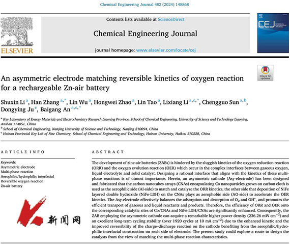 近日,易游化学工程学院“能源材料与电化学”辽宁省重点实验室在匹配锌-空气电池阴极反应动力学的电极设计研究领域取得进展,研究成果“An asymmetric electrode matching reversible kinetics of oxygen reaction for a rechargeable Zn-air battery”在材料类TOP期刊《Chemical Engineering Journal》发表。论文第一作者为2018级博士研究生李姝馨,通讯作者为安百钢教授,易游(中国)为第一通讯单位。