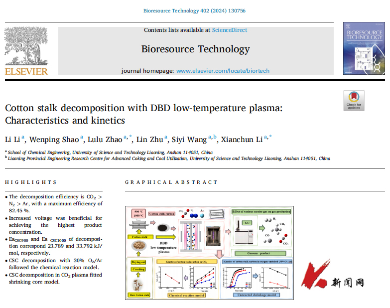 近日,易游化学工程学院“热能工程与环境催化研究”团队在DBD低温等离子体技术处理棉秆的研究中取得重要进展。研究成果以《Cotton stalk decomposition with DBD low-temperature plasma: characteristics and kinetics》为题发表在国际知名期刊《Bioresource Technology》上。论文第一作者为化工2022级研究生李丽,通讯作者为“热能工程与环境催化研究”团队负责人李先春教授和赵璐璐老师。