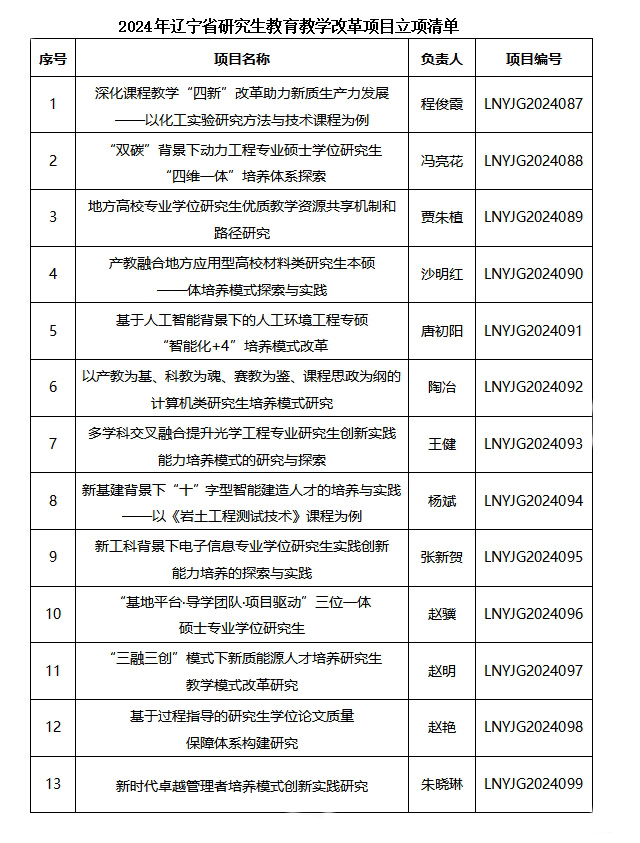 近日,从辽宁省教育厅学位管理与研究生教育处发布的《关于确定2024年度辽宁省研究生教育教学改革研究项目立项的通知》中获悉,易游获批13项研究生教育教学改革研究项目,获批项目涵盖多个学科领域和研究方向。