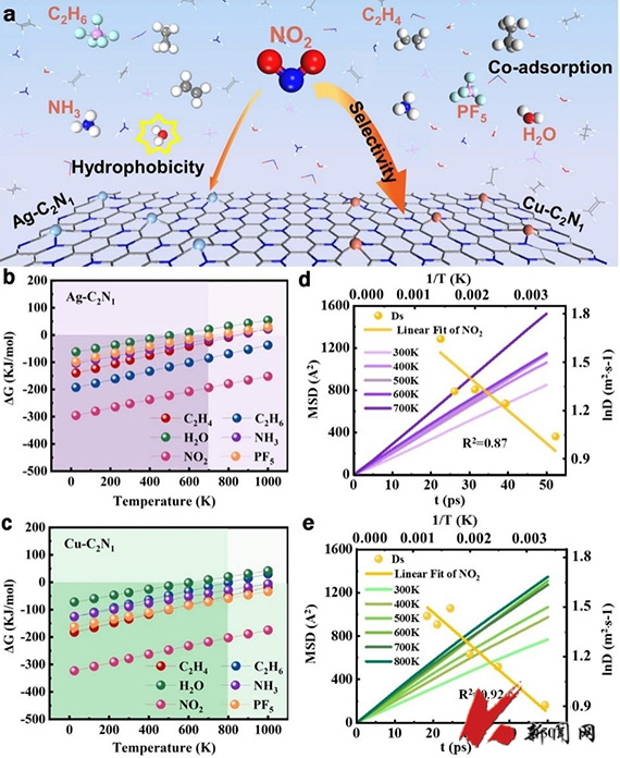 据了解,为避免锂电池在极端条件下产生热失稳问题而造成影响,亟需一种高灵敏度、高选择性的气体传感器对电池热失稳前释放的微量气体NO2、PF5和NH3等进行预警。该研究采用第一性原理计算方法,利用Cu和Ag修饰的碳氮单层材料(Cu/Ag-C2N1)对多种危险性气体共存环境进行了气敏性能分析。研究表明,基于态密度计算,Cu-C2N1材料对NO2表现出高选择性和敏感响应,并且有效避免了湿度的干扰。此外,该研究强调了吉布斯自由能和爱因斯坦扩散方程在分析气体传感器应用范围和气体扩散活化能垒上的重要作用。同时,在不影响选择性、响应性和稳定性的情况下,过渡金属相对于贵金属拥有成本上的优势。该研究为设计高选择性气体传感器和深入理解气固界面相互作用机理提供了新思路。