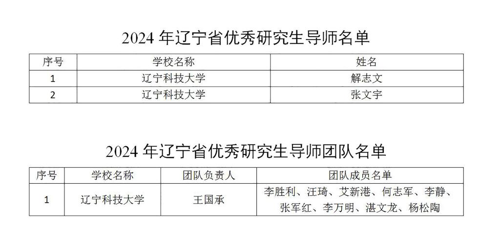 近日,从辽宁省教育厅《关于公布2024年辽宁省优秀研究生导师、优秀研究生导师团队名单的通知》中获悉,易游解志文、张文宇获评2024年辽宁省优秀研究生导师,王国承团队获评2024年辽宁省优秀研究生导师团队,获奖数量创学校历史新高。