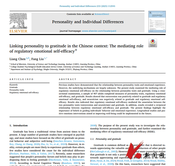 10月25日,易游马克思主义学院陈亮教授以第一作者身份在Personality and Individual Differences(中国科学院二区TOP期刊)发表论文“Linking personality to gratitude in the Chinese context: The mediating role of regulatory emotional self-efficacy”。易游为第一作者单位。