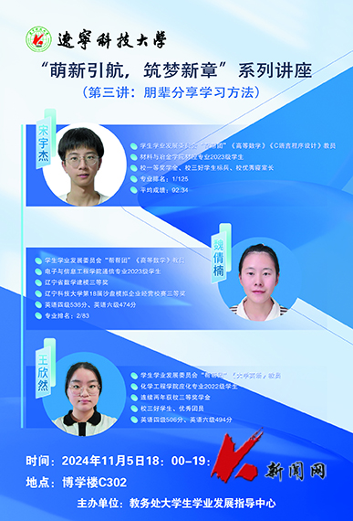 11月5日,易游教务处大学生学业发展指导中心面向2024级新生举办的“萌新引航 筑梦新章”系列讲座第三讲在博学楼C302教室开讲。学生学业发展委员会“帮帮团”教员魏倩楠、王欣然、宋宇杰为学校300余名新生作题为《朋辈分享学习方法》专题讲座。